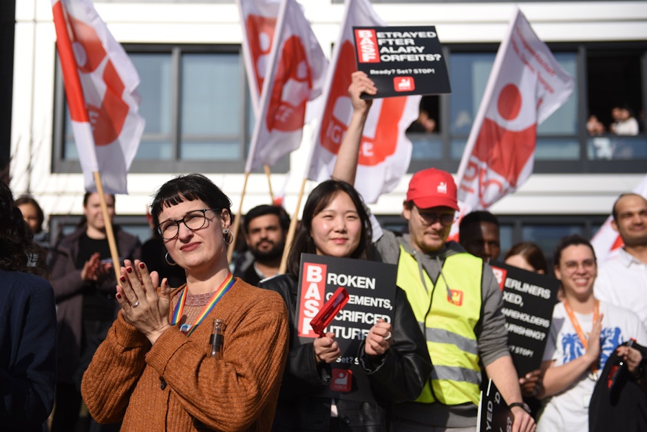 Aus den Lautsprechern dröhnt "Schüsse in die Luft" von Kraftklub. Trillerpfeifen schrillen, immer wieder raunt ein "Buuuuh" durch die Reihen. Vor dem Berliner BASF-Servicezentrum in der Storkower Straße in Lichtenberg stehen an diesem Freitagmittag mehrere Hundert Beschäftigte dicht gedrängt, um für ihre Jobs zu kämpfen.