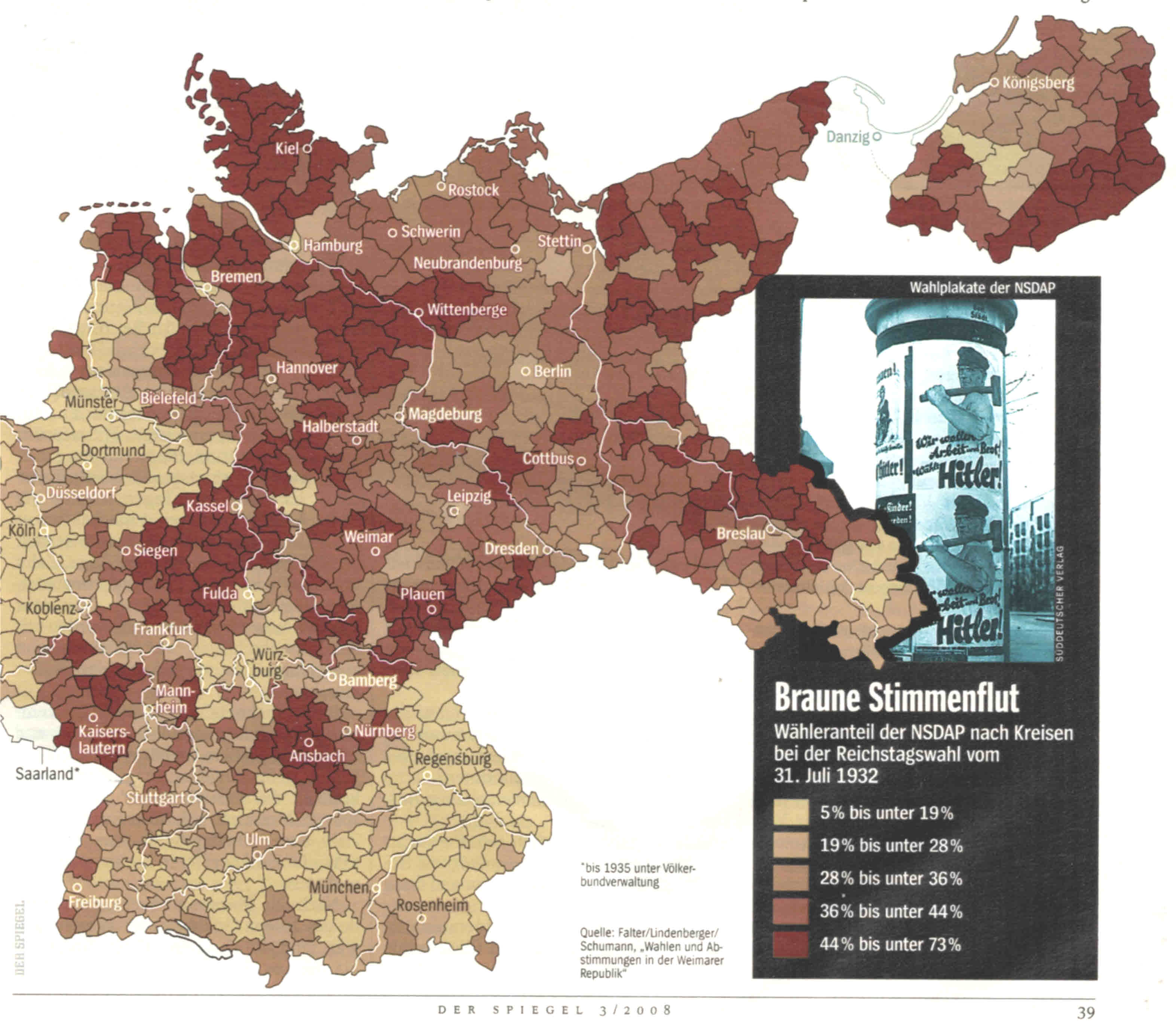 Die NSDAP hingegen bekam Stimmen aus allen Schichten der Gesellschaft, wenn auch deutlich mehr von Protestanten und aus dem Mittelstand, der geradezu panisch einen sozialen Abstieg fürchtete, als von Katholiken, Arbeitern und Arbeitslosen. Letztere votierten lieber für die KPD.