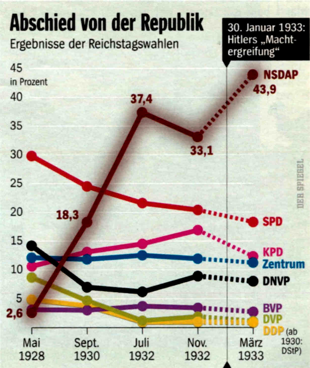 Am 5. März 1933 eilten die Deutschen zur Urne, Wahlbeteiligung: 88,8 Prozent. Es waren die letzten halbwegs freien Wahlen für ein gesamtdeutsches Parlament bis 1990. Die NSDAP, im Wahlkampf inzwischen von der Großindustrie massiv gefördert, kam auf für sie enttäuschende 43,9 Prozent; SPD und KPD erzielten immerhin insgesamt mehr als 30 Prozent.